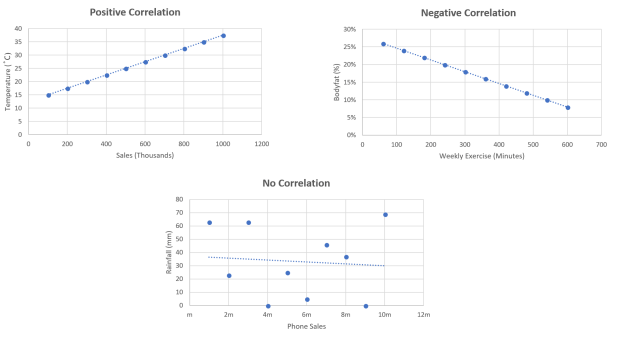 Lets start with some definitions and simple examples: Correlation – a relationship or connection between two or more things. Examples: sunny weather and ice cream sales, time slept and energy throughout the day. These examples both show positive correlation i.e. they both rise together. A negative correlation, when one thing goes up, the other goes down, is still a relationship and can be very strong one i.e. smoking and lung capacity, exercise and body fat (although some might not agree this has a strong correlation!). Finally, we also have a low/no correlation, mobile phone sales and rainfall… they will have no impact on one another. Correlations are measured mathematically on a scale of -1 to 1, 1 meaning a strong positive correlation, -1 a strong negative and 0 representing no correlation. You can see graphical examples of these below.